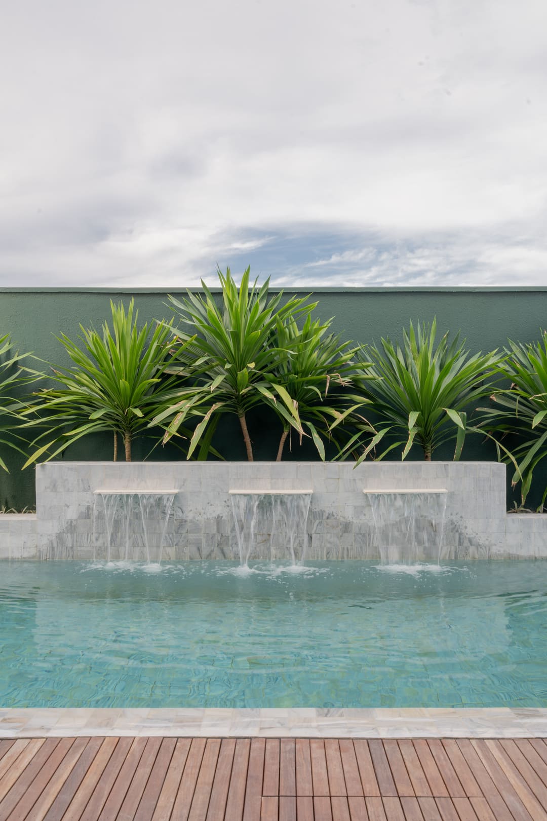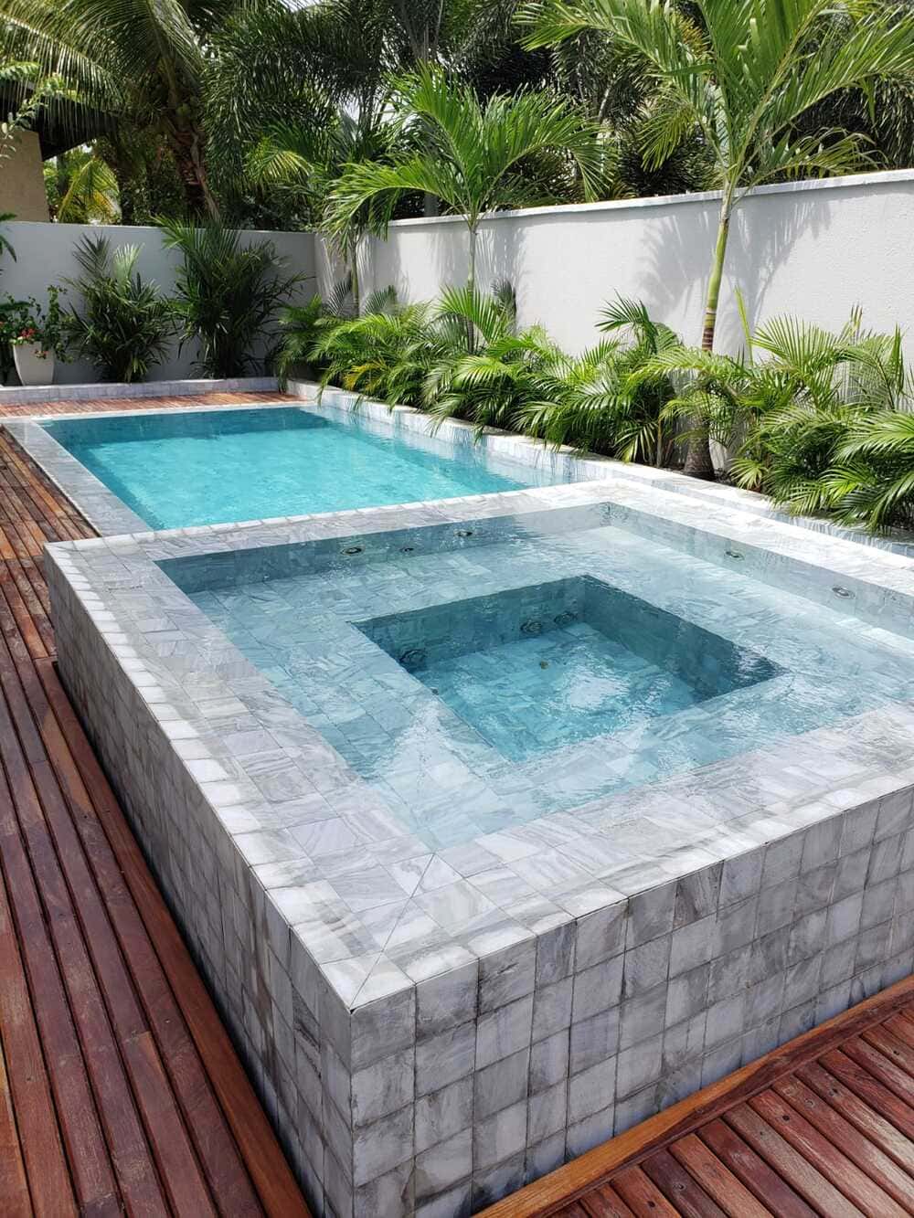 O revestimento Pedra Laguna replica o visual dos mais belos mares na piscina da sua casa. Feito de mármore nacional exclusivo, as peças são cortadas uma a uma e recebem o acabamento Serrado, que as to